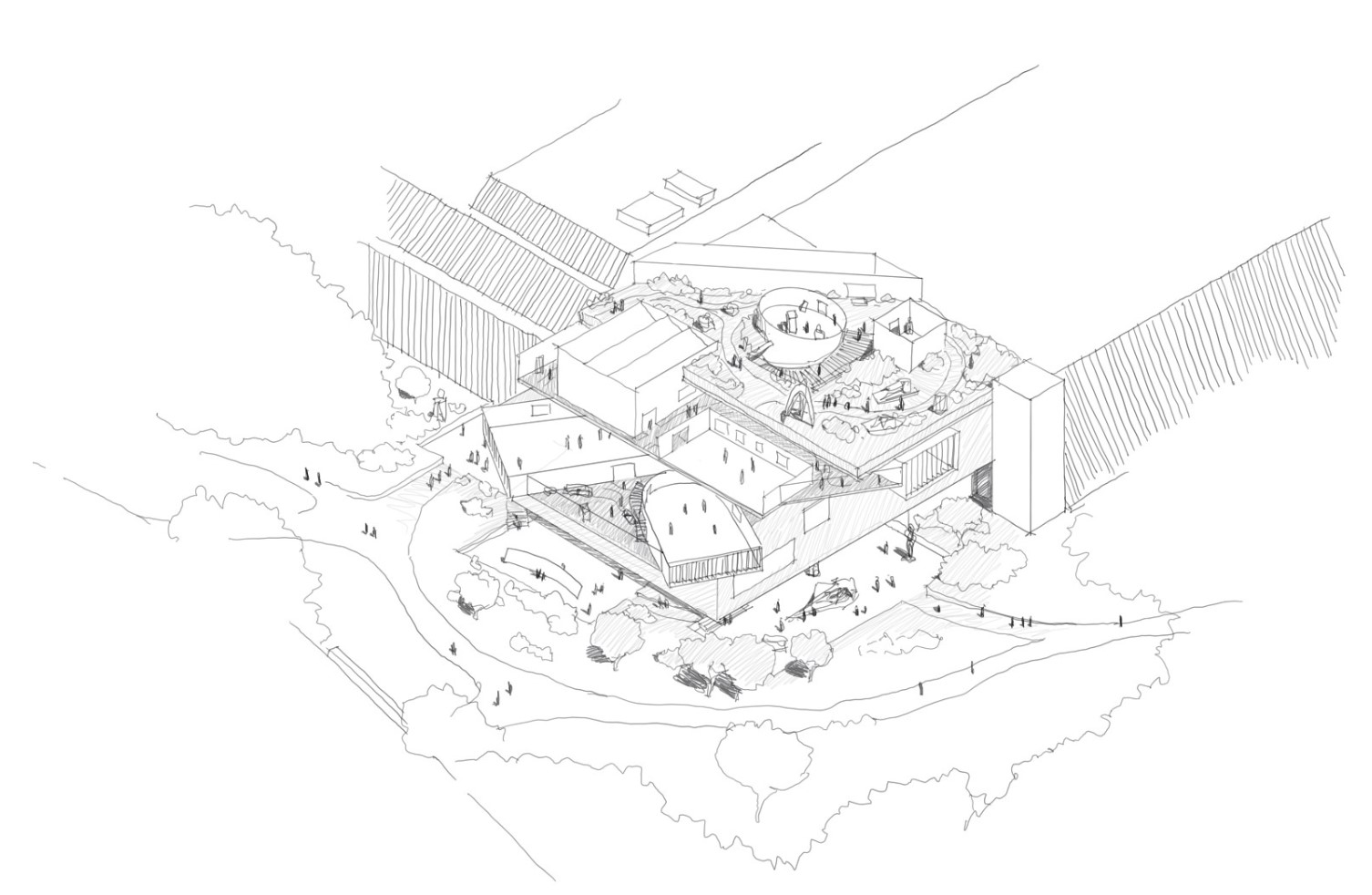 This path is conceived as a connection thread between two “horizons” - a public plaza and garden at the park level, inviting the public to interact with the museum at this formerly closed corner, and an outdoor roof terrace above the galleries, creating a social hub overlooking the Central Park tree canopy.